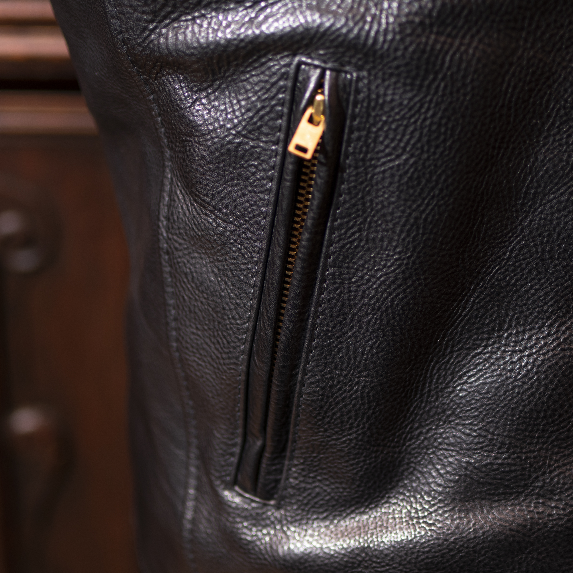 胸部は片側Zip、サイドもZipポケットを標準とし、スポーツジャケット的に着たい方は片玉縁仕様へ変更も可能。