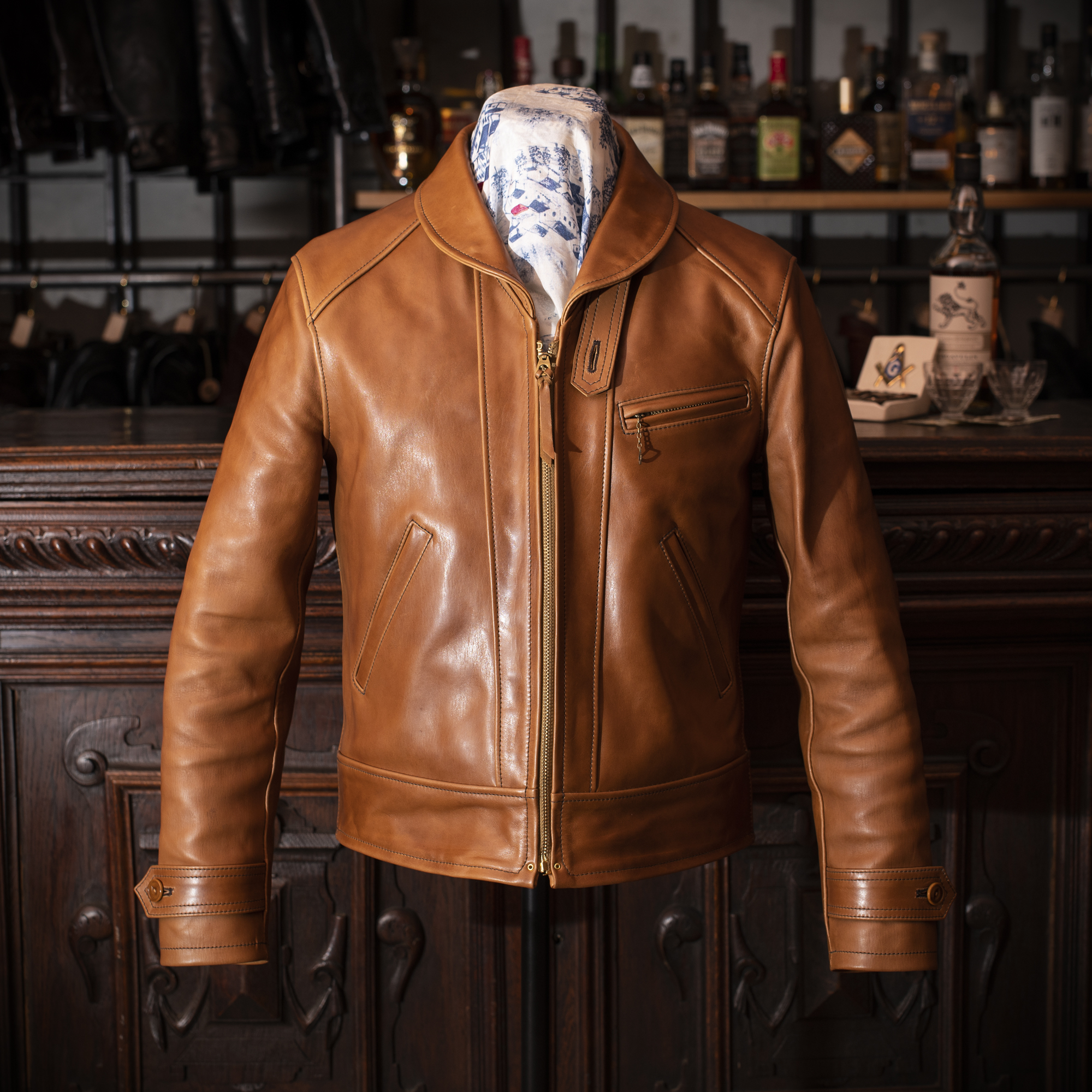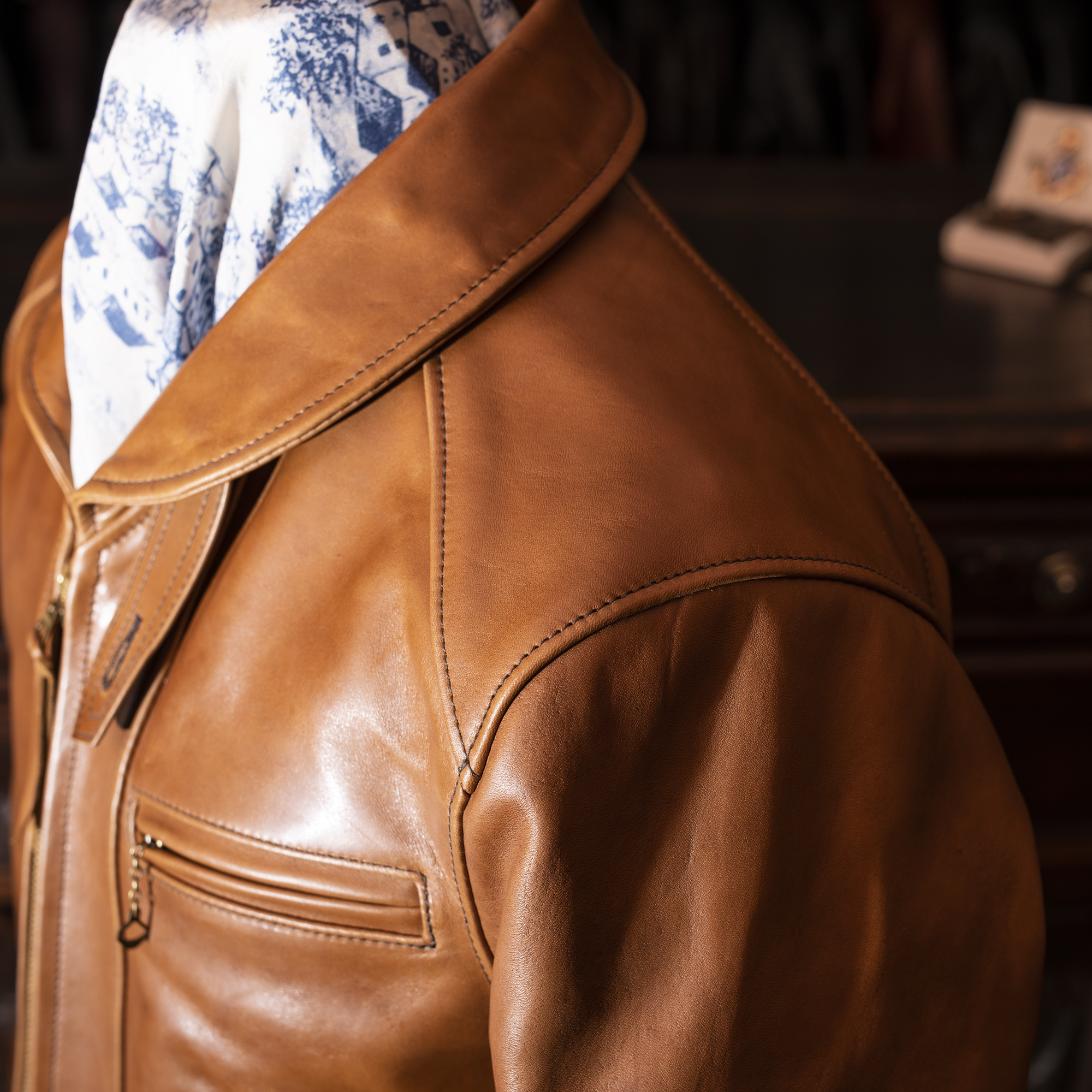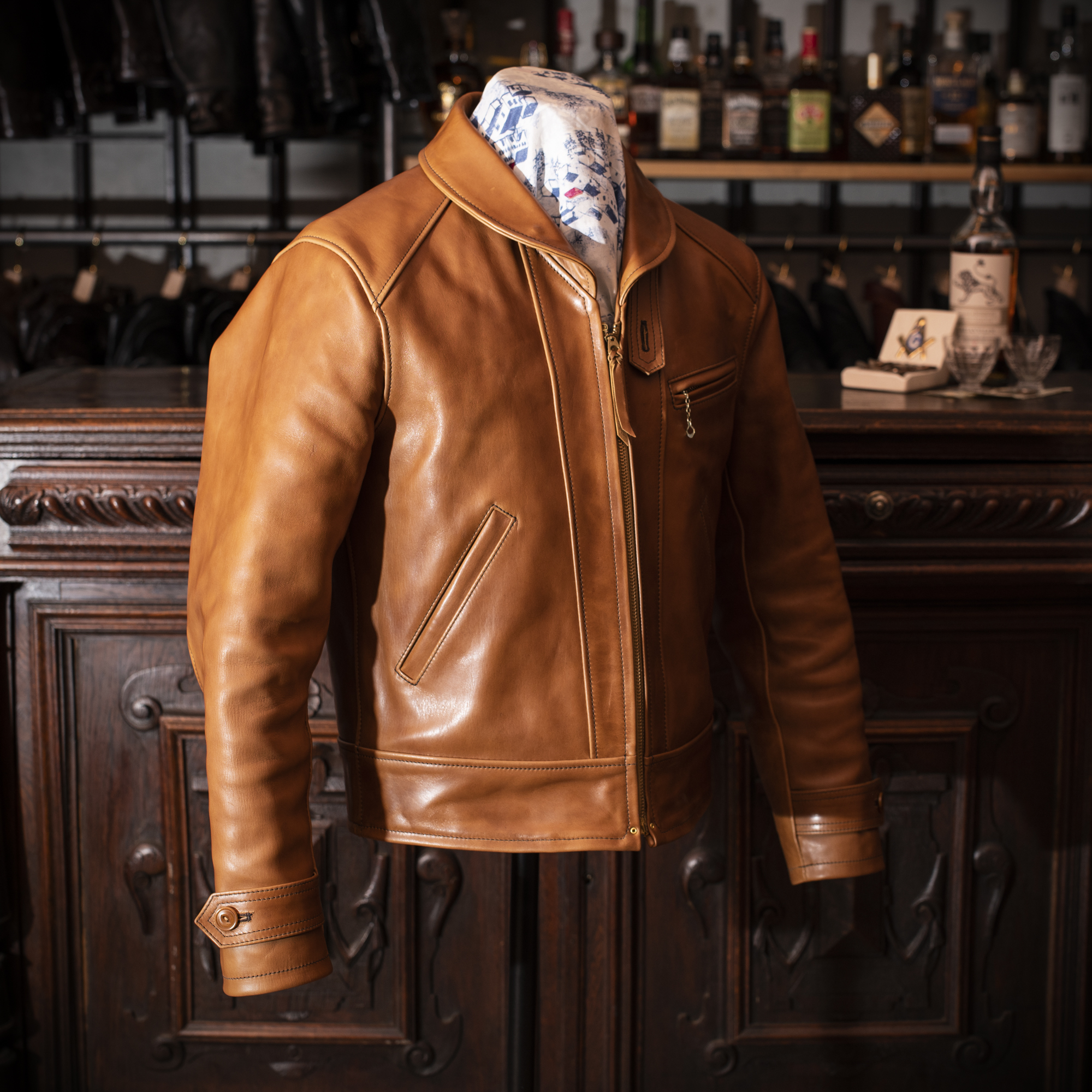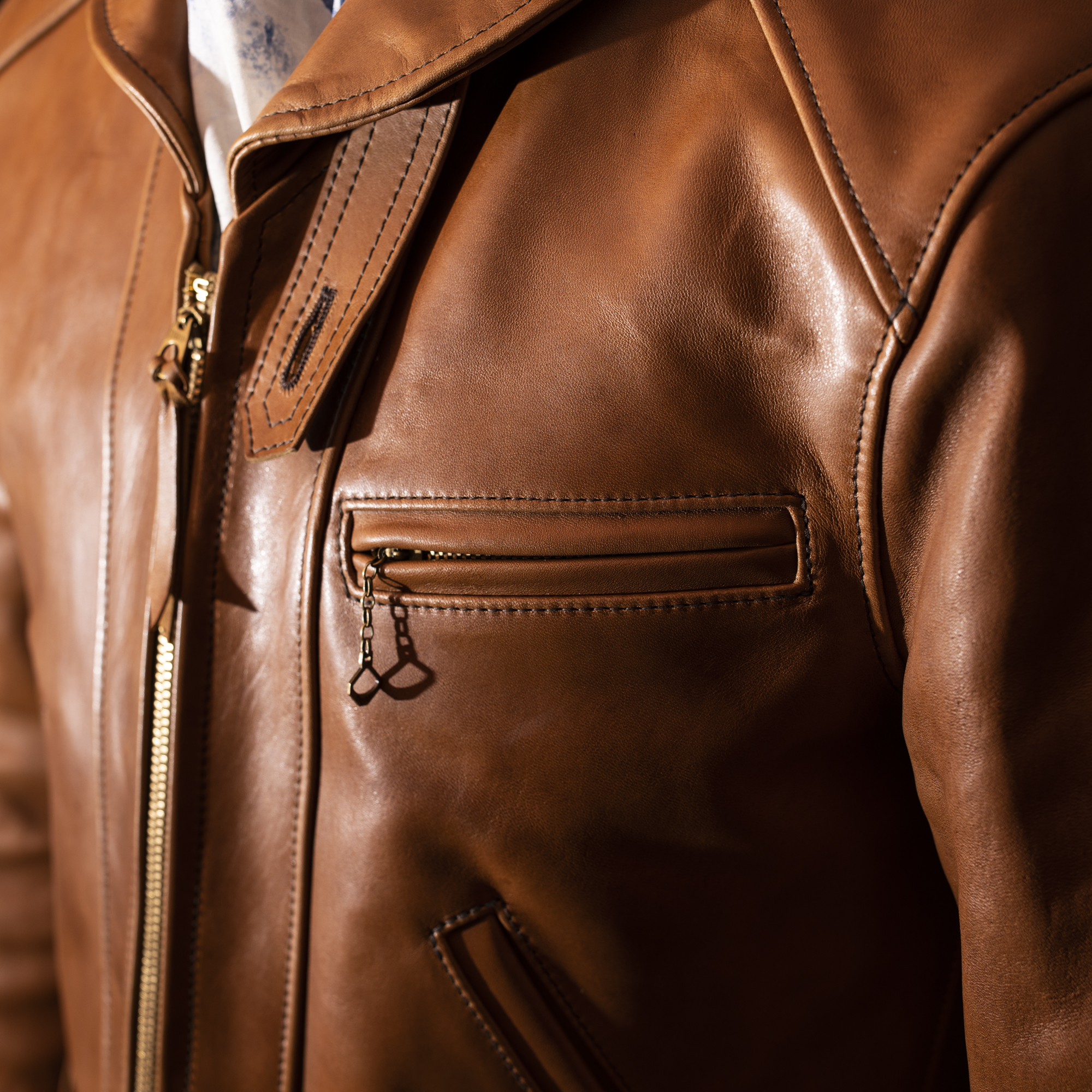1930年代に見られるアヴィエイター/コサックと呼ばれるスポーツジャケットの系譜を踏まえつつ、当時このジャンルでは少数派だったフロントジッパー仕様の個体に着想を得て、MUSHMANS Leatherの観点で再構築しています。