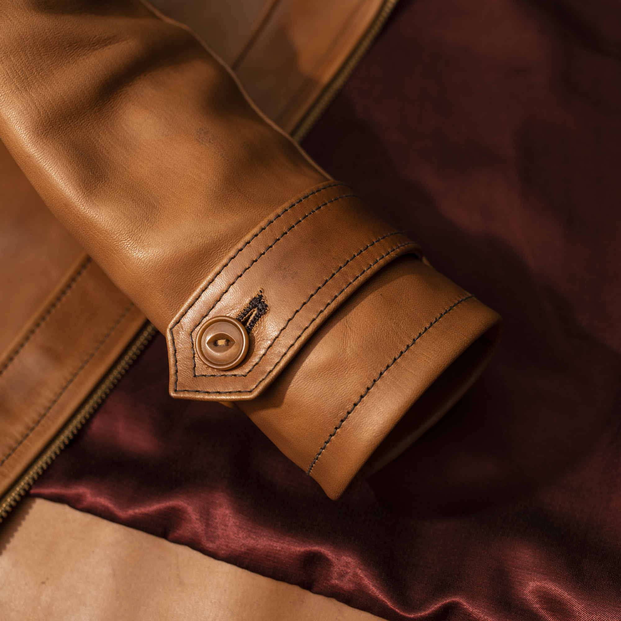 フロントジッパーは時代背景に合わせハトメ仕様のHooklessを採用し、袖口はアジャスターストラップ+コロゾ釦で調整可能です。